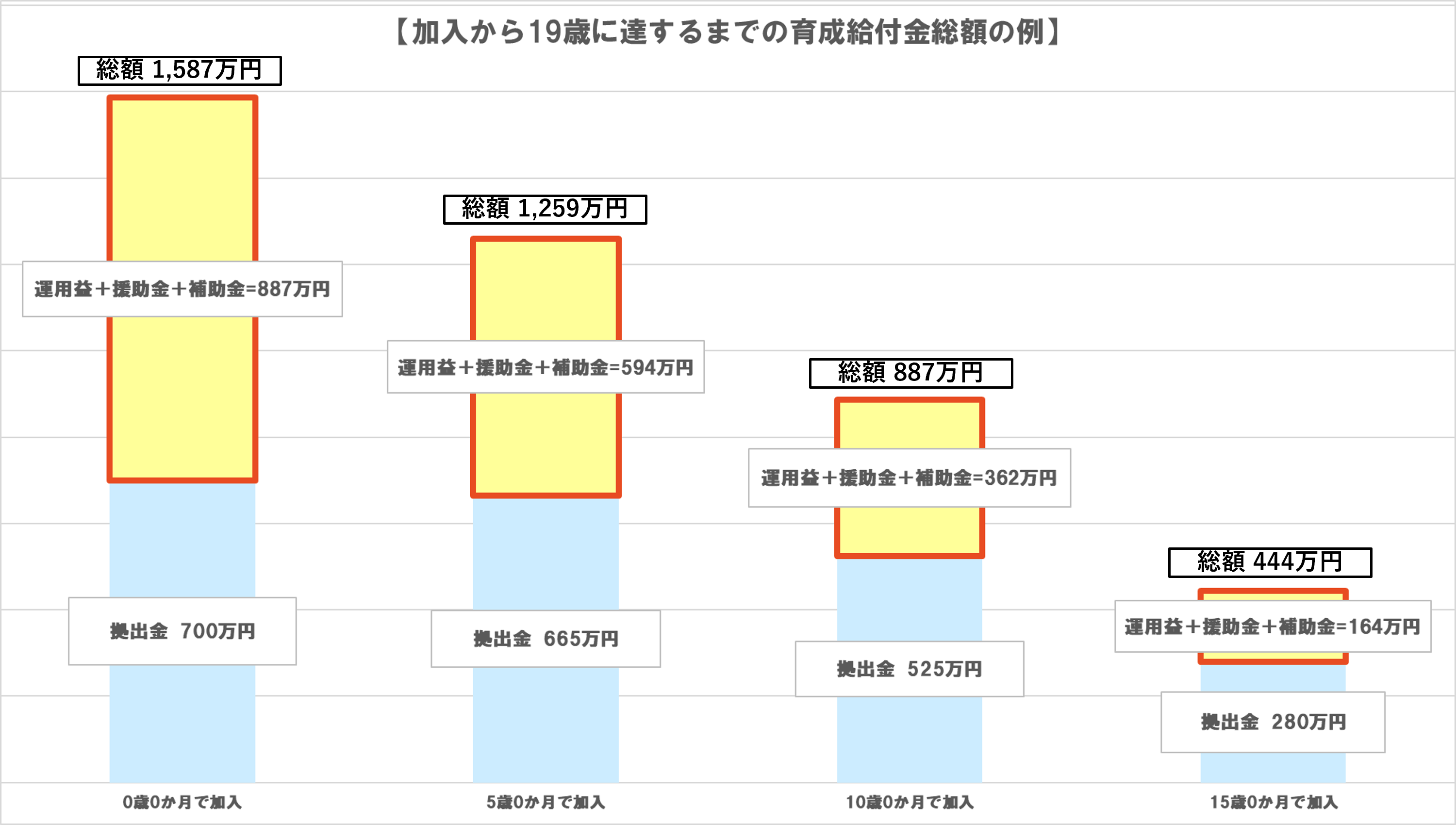 最終的に受け取る育成給付金の総額は、何歳何ヶ月で加入したかによって異なりますが、おおよそ次の金額になります。