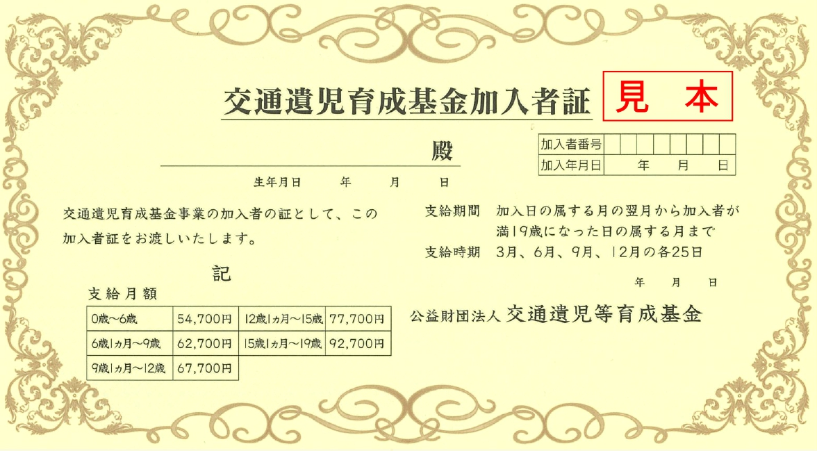 加入後、2週間以内に「交通遺児育成基金加入者証」をお手許に送付いたします。 ![]() (加入者証:見本)